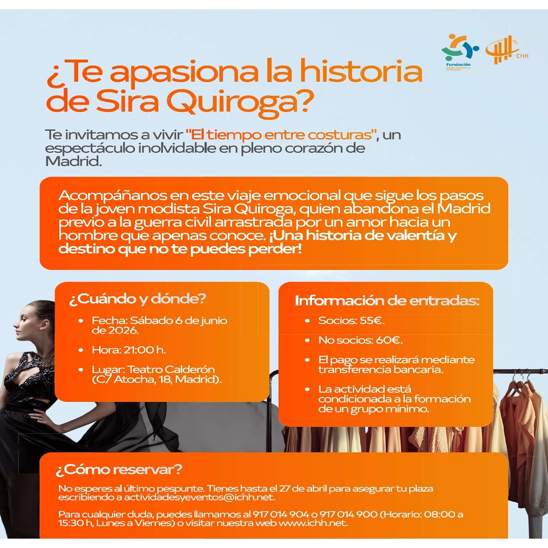 ¿Te apasiona la historia de Sira Quiroga? 🧵✨ Te invitamos a vivir un viaje emocional inolvidable con el espectáculo «El tiempo entre costuras», en pleno corazón de Madrid.